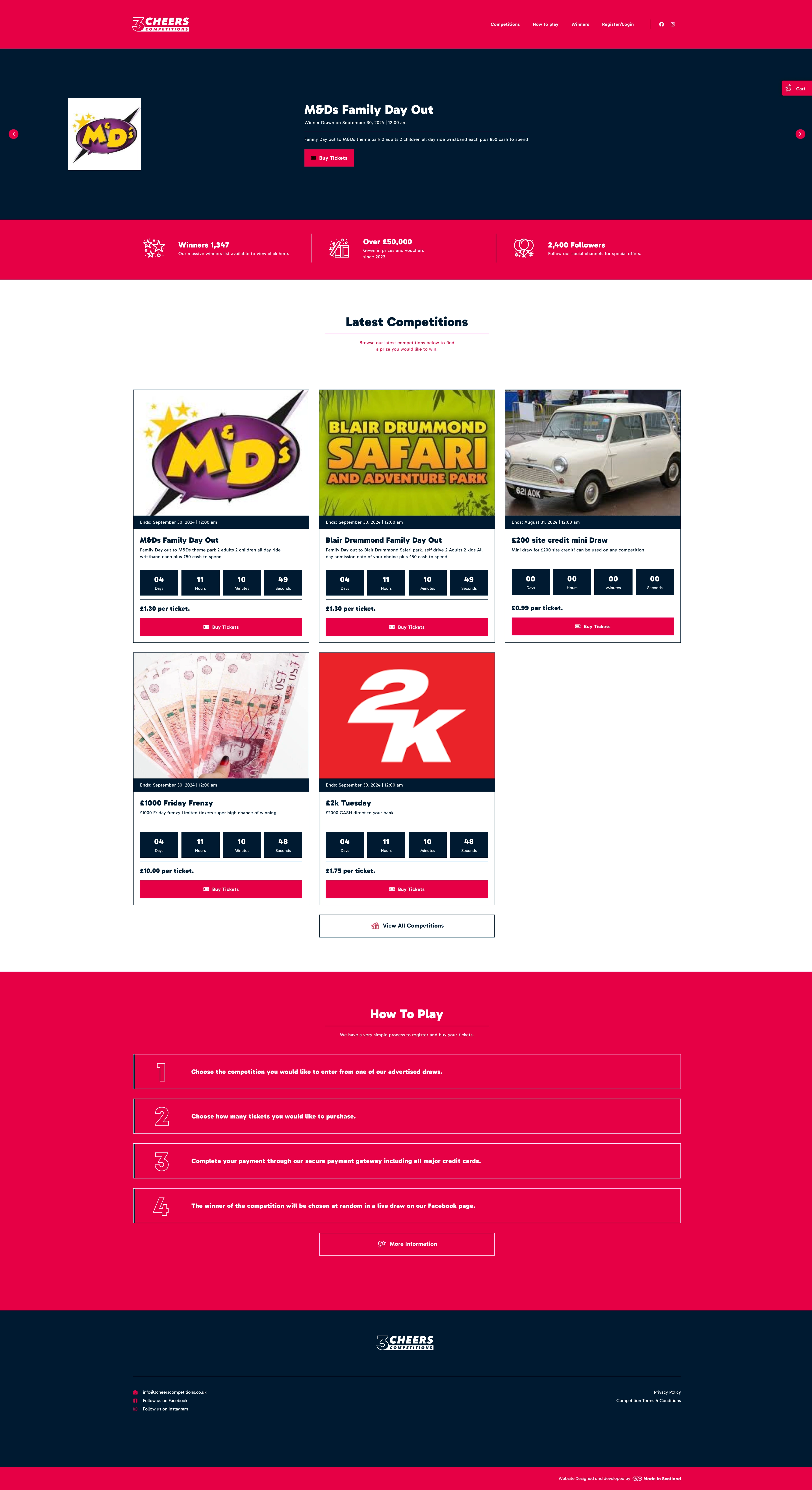 The website features integrated competition software that works seamlessly with our content management system. This allows 3 Cheers Competitions to manage all users and competitions from a single platform. Additionally, the software is set to automatically select winners at random, enabling the client to focus on marketing efforts and customer engagement while streamlining the competition management process.