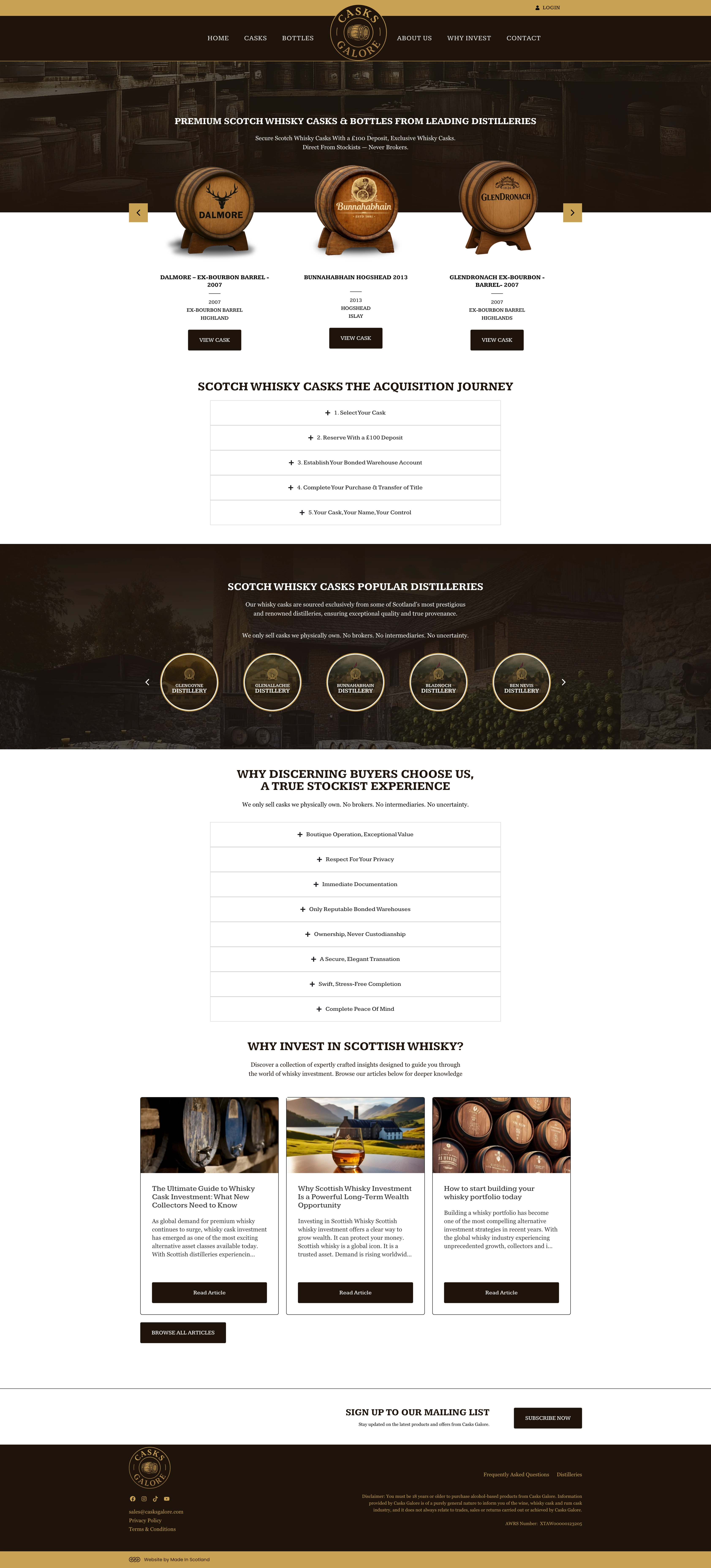 Casks Galore, a specialist retailer focused on premium Scottish whisky casks and rare collectable bottles, approached us to create a bespoke e-commerce platform that would reflect the exclusivity and heritage of their offering. With a niche audience of investors, collectors, and enthusiasts, the website needed to balance refined design with robust functionality—delivering an experience that felt both luxurious and highly informative.