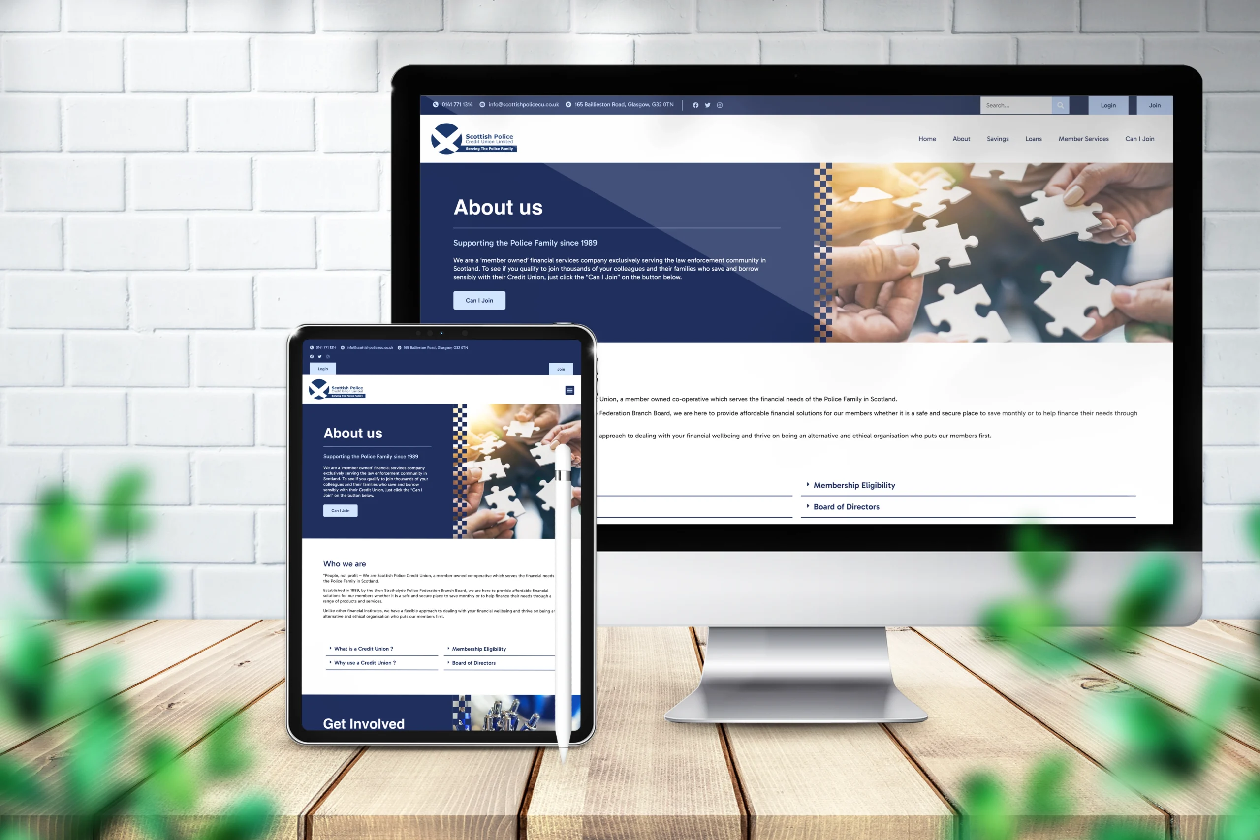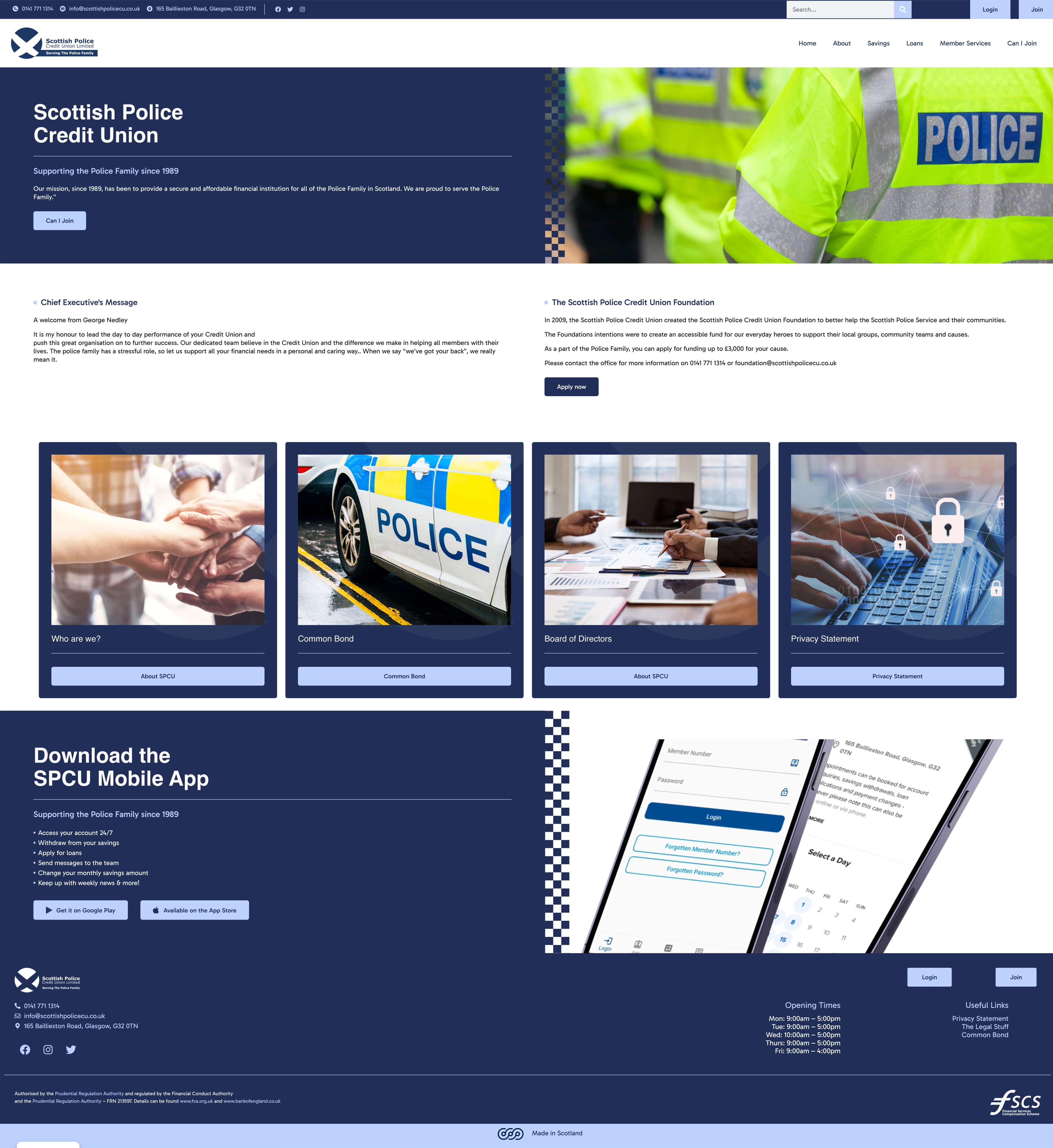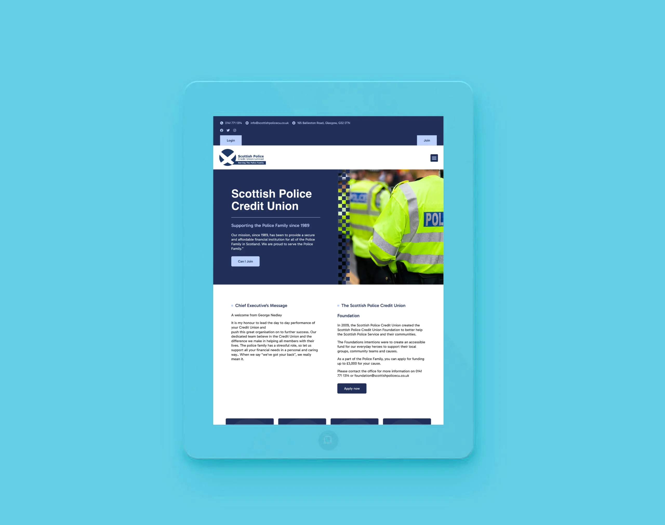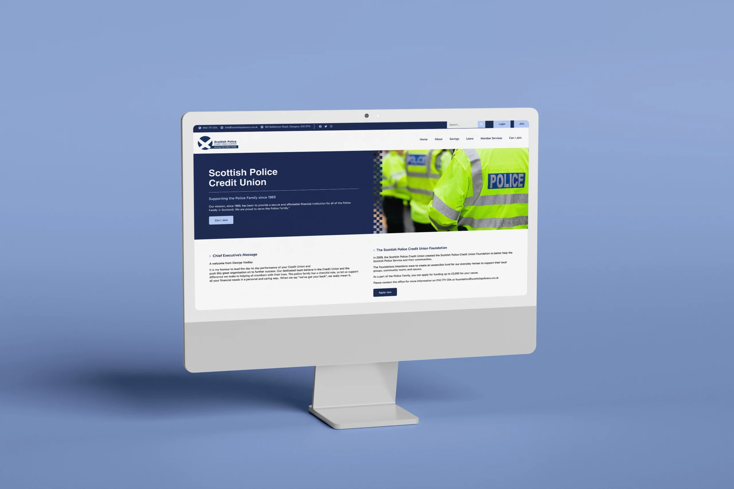 Scottish Police Credit Union (SPCU) approached us to design and develop a new branded website that would offer a modern, user-friendly platform for both current and potential police staff. The goal was to create a welcoming digital space where members of the Scottish Police Force could easily join the credit union, access information, and explore the variety of services offered, from savings accounts to loan products. We worked closely with SPCU to ensure the website would embody their values and provide a seamless experience for users.