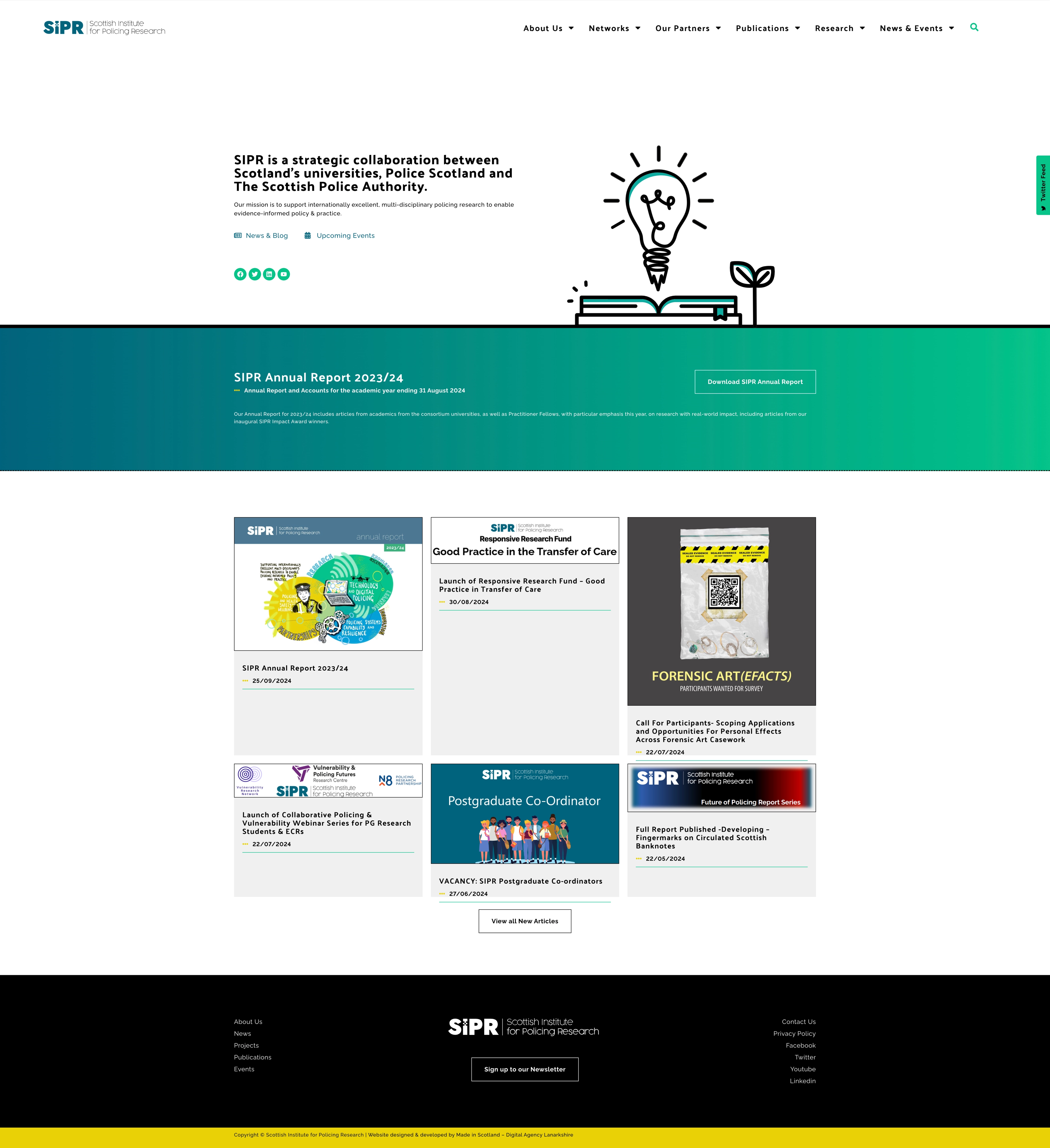The Scottish Institute for Policing Research (SIPR) approached Made in Scotland with the goal of developing a new website and digital identity package that would better reflect their values and enhance accessibility. SIPR wanted their digital presence to be modern, user-friendly, and easily navigable by all audiences. A key component of the project was to design a platform that could support the organization’s extensive archive of valuable resources and research materials, making them readily available to users online.
