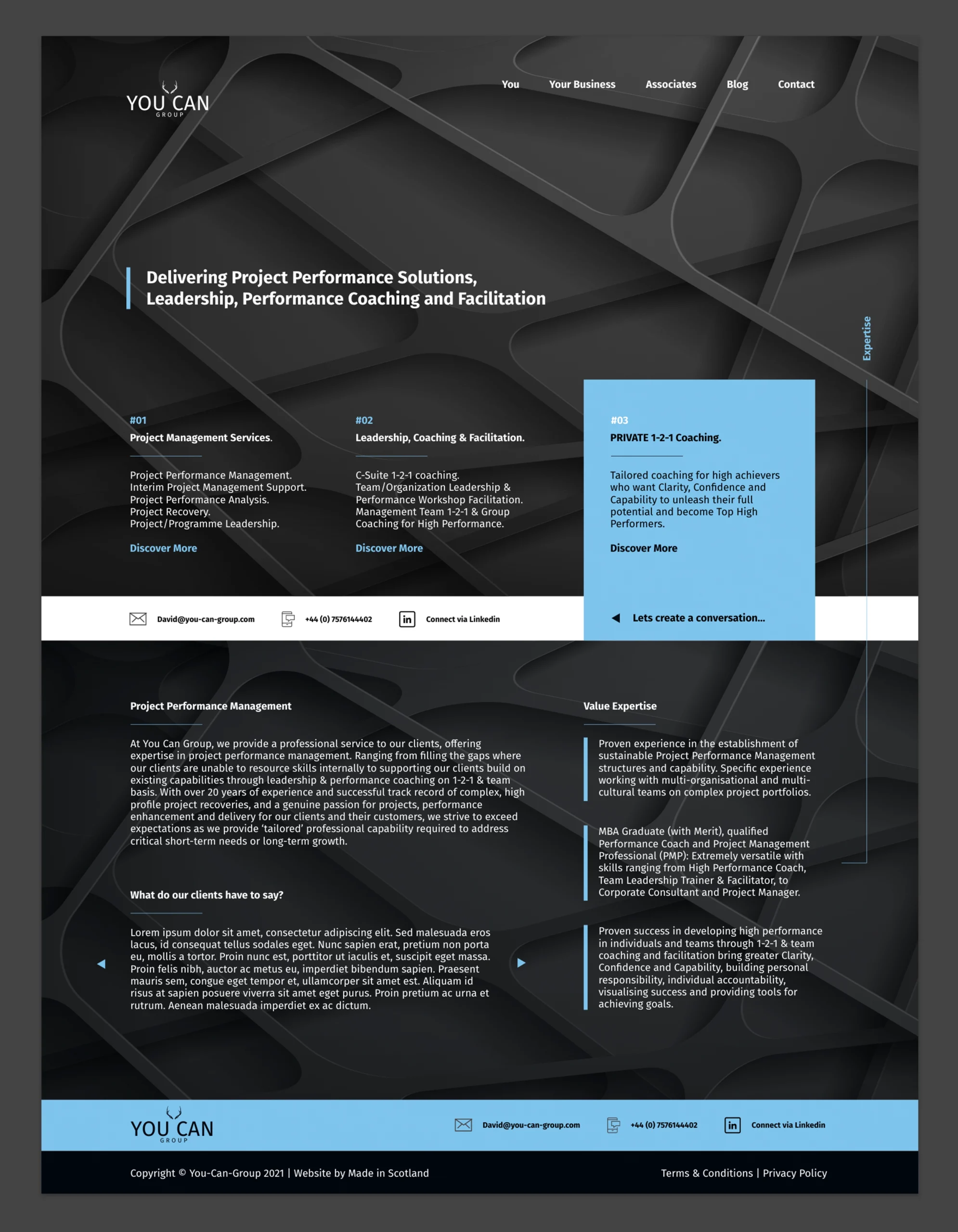 You Can Group provides a professional service to their clients offering expertise in project performance management. Our client has over 20 years experience in business and project management coaching entailing high profile project recoveries and a genuine passion for project enhancement and delivery for clients and their customers. The business operates globally working with small to large organisations with focus on improving the development of individuals.